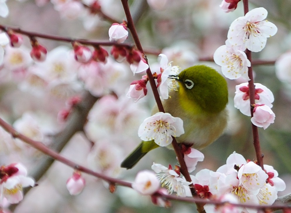 梅が咲いていたんで写真を何枚か。小鳥が止まっていたんで「ウグイス?」と思い何枚か撮ったんですが、帰って見てみたらどうもウグイスではなかったようで。メジロかな?