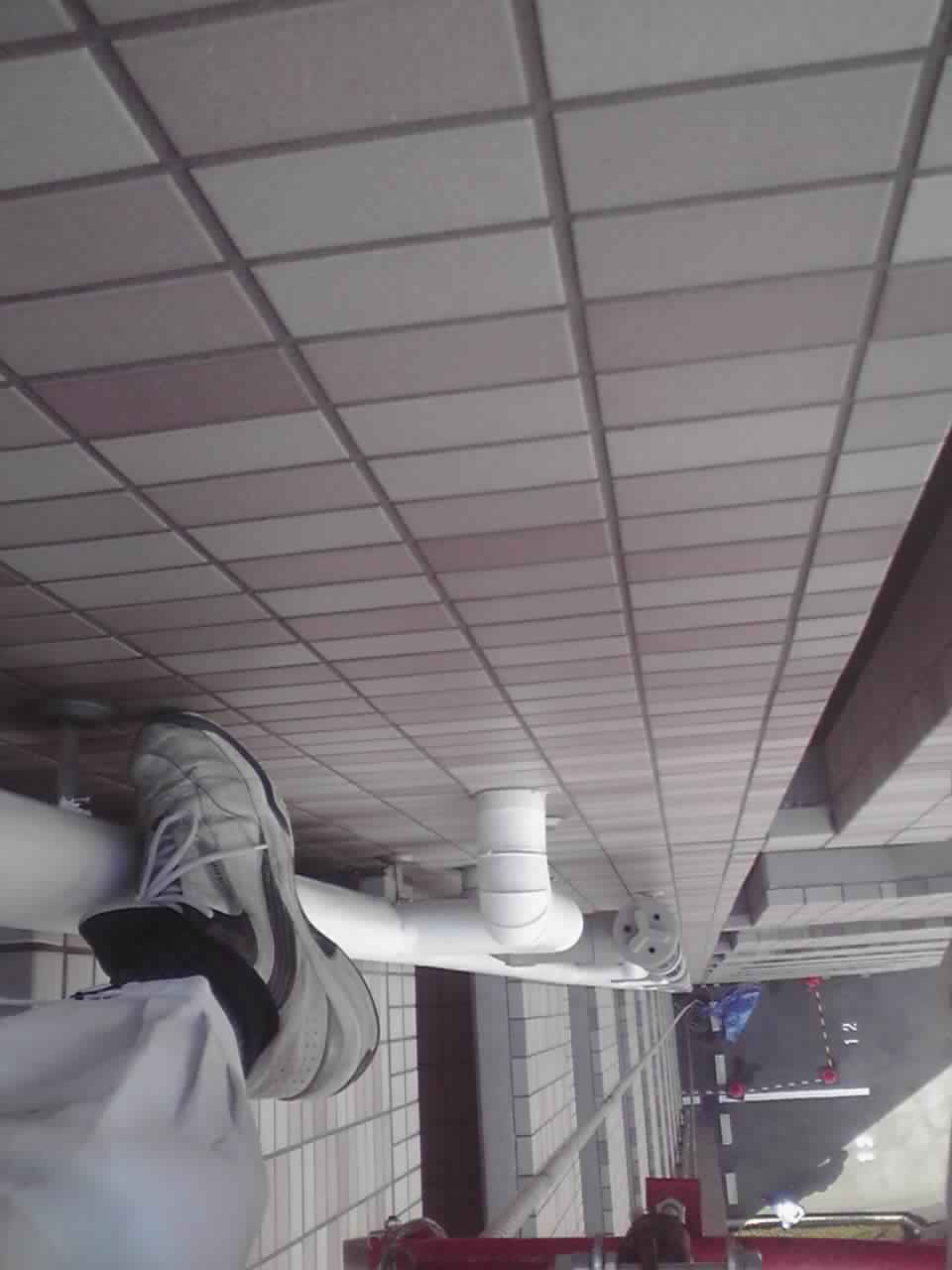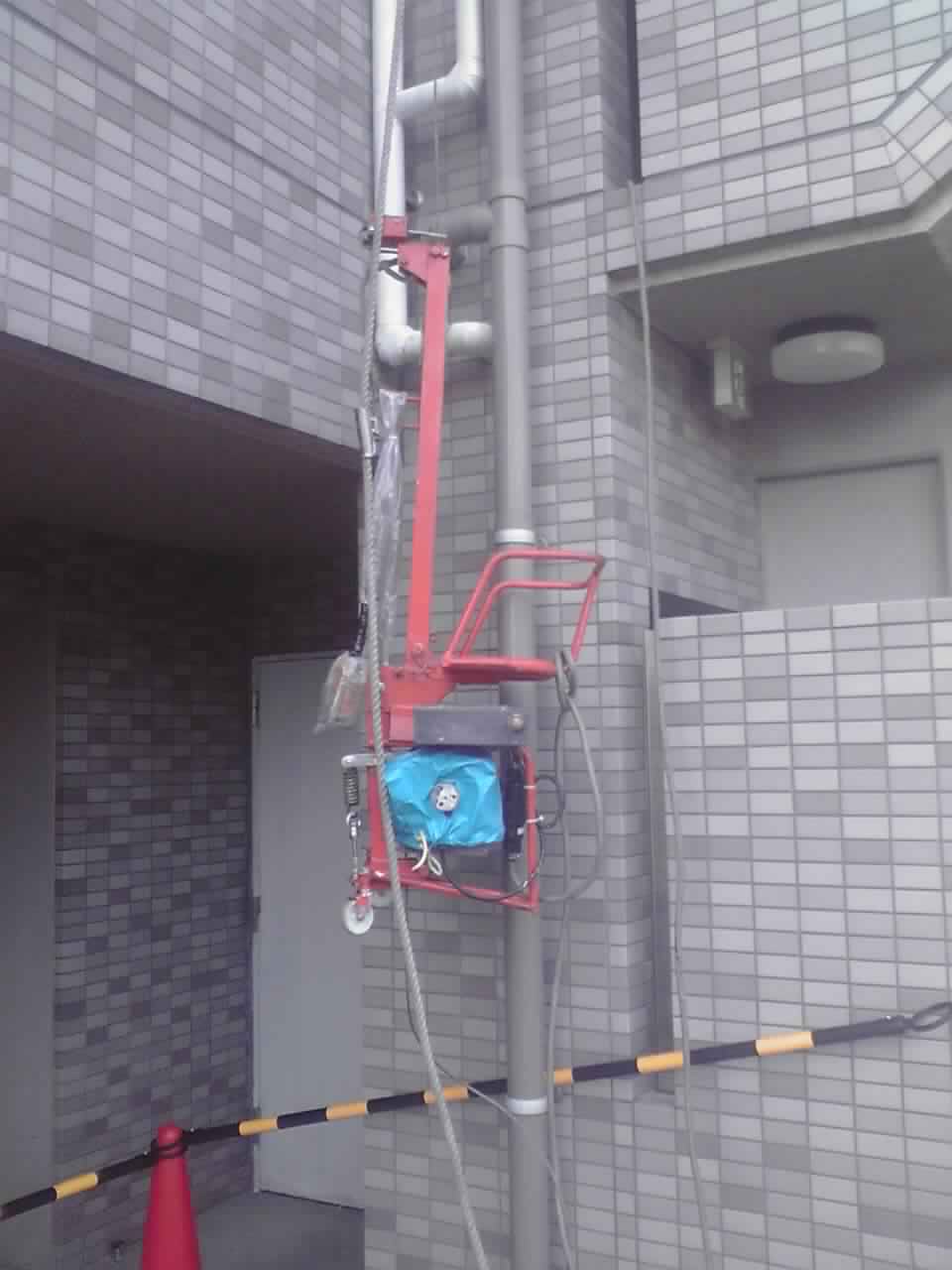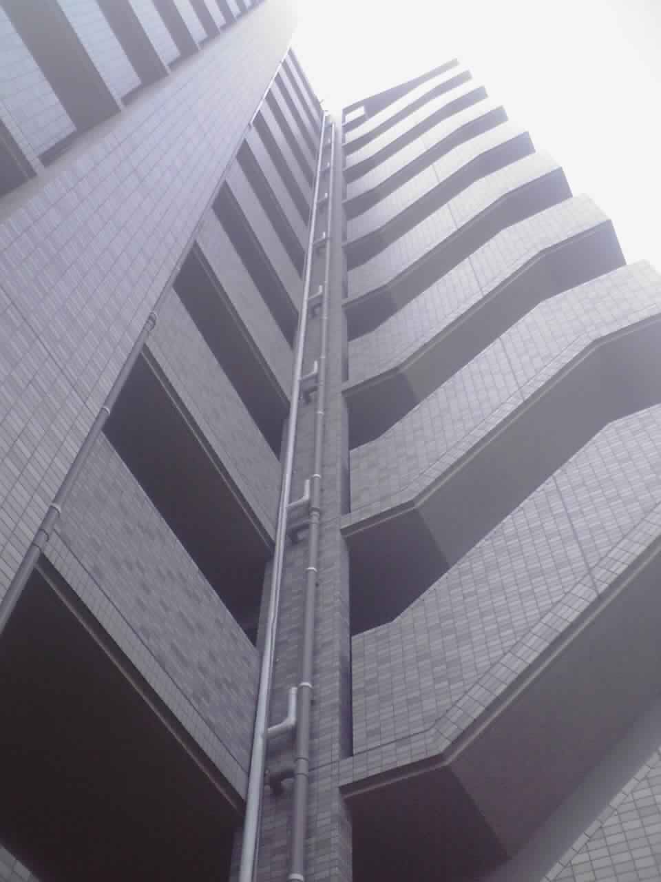 最上部から見下ろしてみる。この写真だとあまり高さは感じられないかな。携帯カメラでこんなものを撮る余裕があるくらいだから、高さに対する恐怖感というのはありません。それよりも怖いのは、「落ちる」こと、です。もちろん、二重三重の安全機構があるので、落ちることはまずないのですが。ただ、ゴンドラの据え付けに関しては絶対に自分でします。他人が据え付けたものなんて、怖くて乗れませんからね。以前、他人が据え付けたゴンドラ(その時は2本吊りだった)に何の確認もせずに乗ったところ、上がっている最中に片方のワイヤーがズレてゴンドラが傾くという事故(?)に遭いました。幸いにも安全機構のおかげでゴンドラも人間も落ちることはなく、大したことはなかったんですが、気持ちのイイものではありませんからね。これからこういう仕事は確実に増えてきますから、慣れることなく驕ることなく、常に初心者の気持ちで取り組むようにしないと。新聞の1面を飾るようなことだけは避けたいものです。