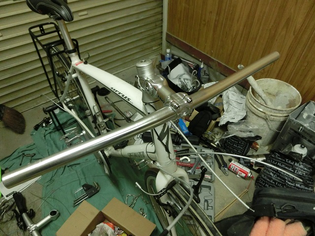 仮止めだけどブレーキ・シフトレバーやグリップ、バーエンドなどを取り付け、ワイヤーを通して今日はおしまい。明日はワイヤーを固定したら最大の難関である前後ディレイラーの調整に挑むのですが、数カ月前にシフトワイヤーを交換した時にリアディレイラーの調整にむちゃくちゃ手こずったので、今回は1速増えてよりシビアな調整が要求されるはずだし、明日中に終われるかどうか。なにより心が折れそうで、今からちょっとげんなりしております。取り敢えず整備マニュアルを熟読しておこう。