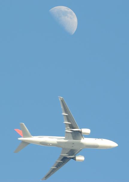 月と飛行機をからめて。お月さんの真ん中を貫いて欲しかったんですが、これだけ距離があるとこちらが動いても構図はほとんど変わりません。