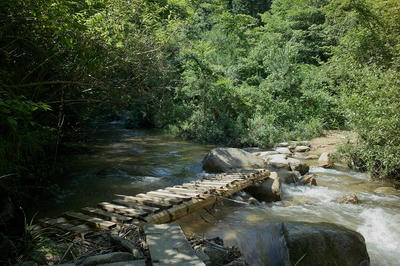 スズメバチに怯えながら山道を突き進むと、ようやくトゥエンティクロスの一本目が現れました。写真撮りたかったんですが、沢渡り用の橋(幅50cmほどの板)に年の頃なら50~60くらいのお姉さまたちがベンチ代わりに腰かけていまして、足湯のように水浴びをされていました。通してください(&撮らせてください)と言う勇気もなく、もとよりそのつもりでトレッキング用のサンダルを履いてきていたので、「お兄さん、そのまま川に入って渡ったらいいやん。気持ちいいよ、キャキャキャ」と言われるがままにジャバジャバと沢渡り。関西のオバチャンはやっぱ強いなぁ。
