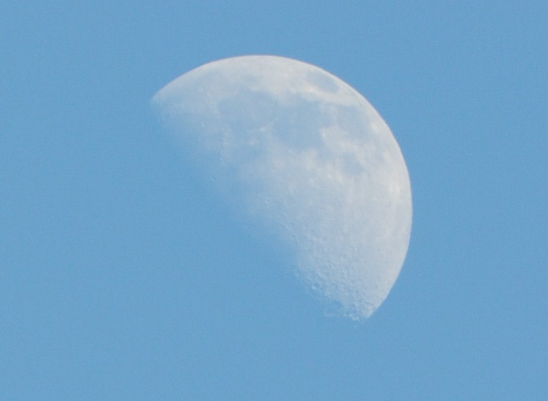 お月さんを出来るだけ拡大してみました。うっすらとクレーターらしきものが見えます。300mm(換算450mm←これちょっとややこしい)の望遠でもこれだけ寄れるんですYO!600mmとか800mmだと一体どんな風に撮れるんだろう?誰か僕に「ロクヨン」か「エビフライ」ください。